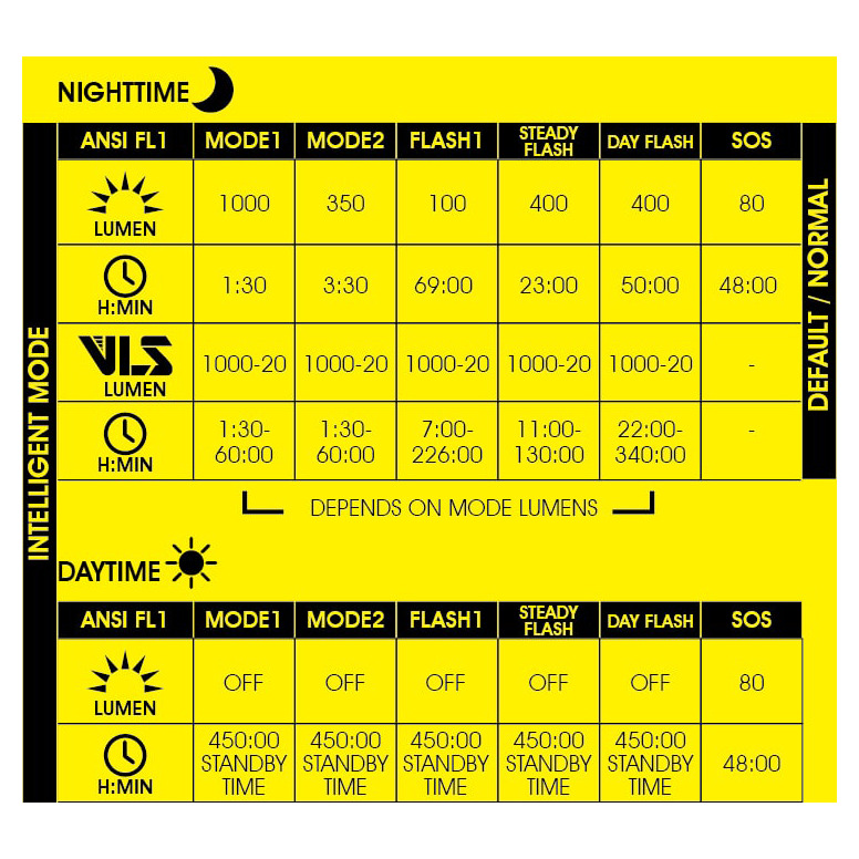 Features - 6 modes: MODE 1 / MODE 2 / FLASH 1 / FLASH 2 / DAY FLASH / SOS
