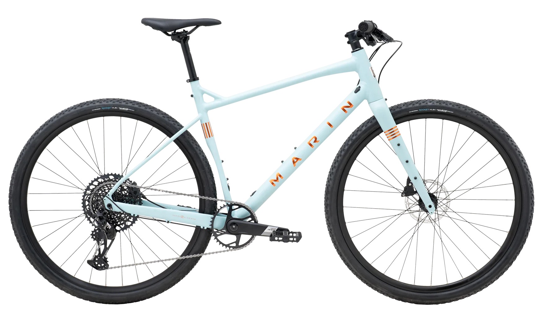 | Style | The DSX is the mountain biker's gravel bike with familiar hand positioning, reliable 1x drivetrains, large tire clearance, and dropper post routing for better off road control, and on road descending stability. The DSX is a flat bar gravel bike based on our Gestalt X drop bar platform with Series 3 aluminum frames and carbon forks with large tire clearance, low standover, hydraulic disc brakes, and 1x drivetrains with the comfort and heads up positioning of a flat handlebar. Mountain bike sensibilities in a flat bar package capable of fast commutes,long Saturday adventures spanning pavement and light singletrack, and all-day gravel events. Frame: Series 3 DSX, 6061 Aluminum, Tapered Head Tube, Relieved BB, Internal Cable Routing, Mudguard and Rack Mounts, Flat Mount Disc, 142x12mm Thru-Axle Fork: Marin Full Carbon w/ Tapered Steerer, 12mm Thru-Axle, Flat-Mount Disc, Fender Eyelets Headset: FSA No.42 ACB, Sealed Cartridge Bearings, 1 1/8" x 1 1/2" Stem: Marin 3D Forged Alloy Handlebar: Marin MiniRiser Grips: Marin MTB Brake Levers: SRAM Hydraulic Brakes Front: SRAM DB-S300 Flat Mount Hydraulic Disc, 160mm Rotor Brakes Rear: SRAM DB-S300 Flat Mount Hydraulic Disc, 160mm Rotor Tires: Vee Tire Co. Rocket Man, 700Cx44mm Rim: Marin Aluminum Double Wall, 21mm Inner, Disc Specific, Tubeless Compatible Hub Front: Forged Aluminum, 100x12mm, Disc, 32H Hub Rear: Shimano Forged Aluminum, 142x12mm, Microspline, Disc, 32H Spokes: 14g Black Stainless Steel Derailleur Rear: SRAM Apex 1, 12-Speed Shift Lever: SRAM NX 12-Speed Chain: SRAM NX Eagle Cassette: SRAM CS-XG-1275, 10-52T Crankset: SRAM Apex 1, 40T Bottom Bracket: SRAM DUB BSA Pedals: Commute Platform Saddle: Marin DSX Seatpost: Marin Alloy Extra1: Bolt-On Thru-Axles F and R |